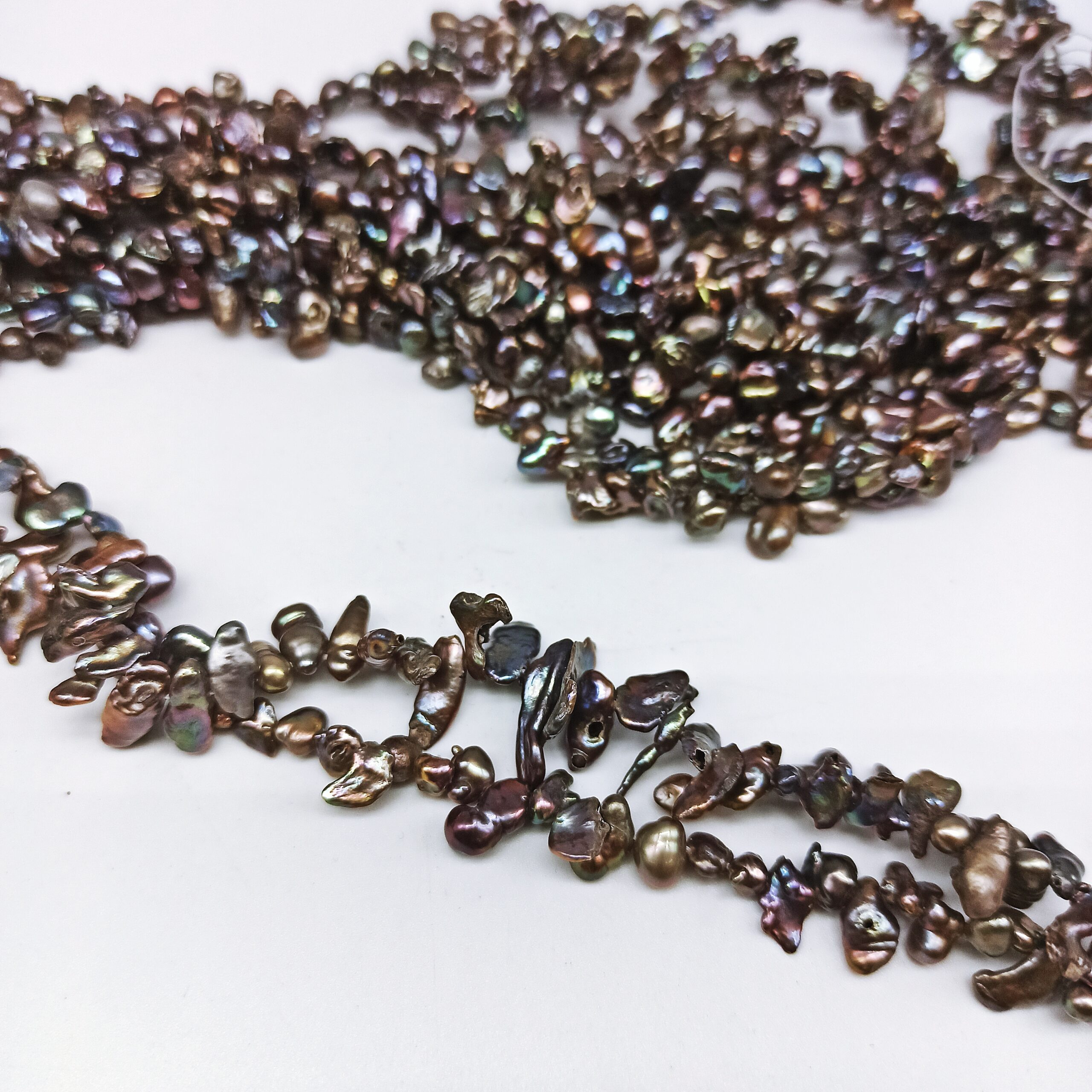 Perle di fiume neturali formato chips, ogni pezzo ha una forma diversa caratteristica della lavorazione a chips (o scaglie) delle pietre dure, questa lavorazione consiste nel trasformare frammenti grezzi in lavorati lisci levigati e forati, forme morbide e semiregolari.