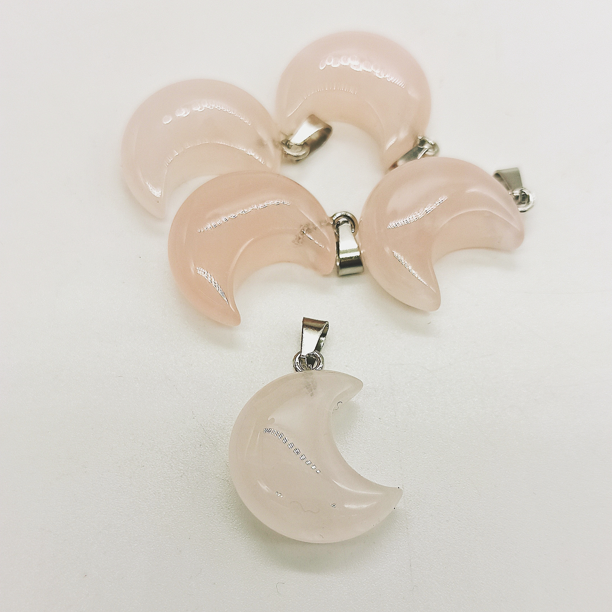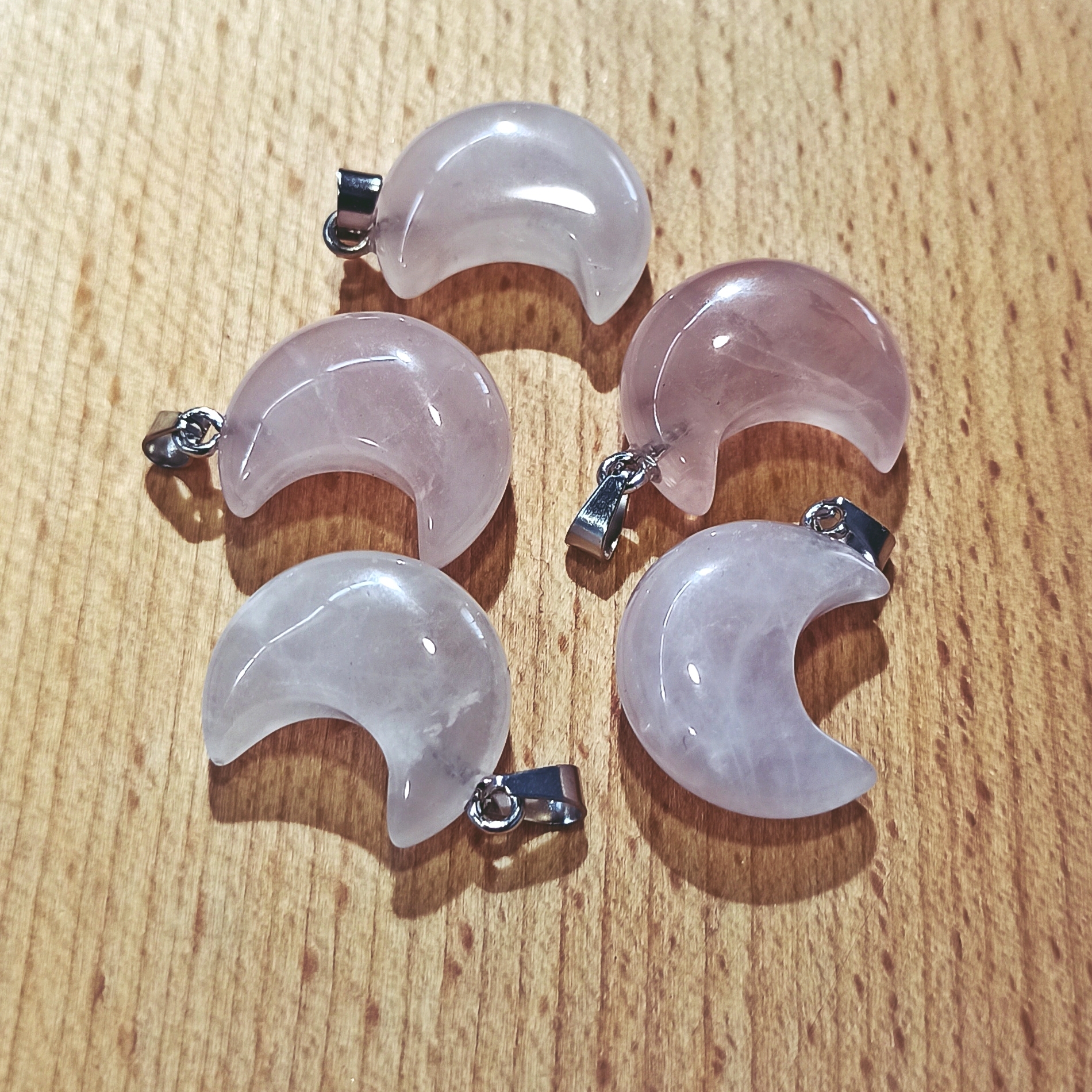Ciondolo a forma di luna in quarzo rosa con gancetto in acciaio per catenina.