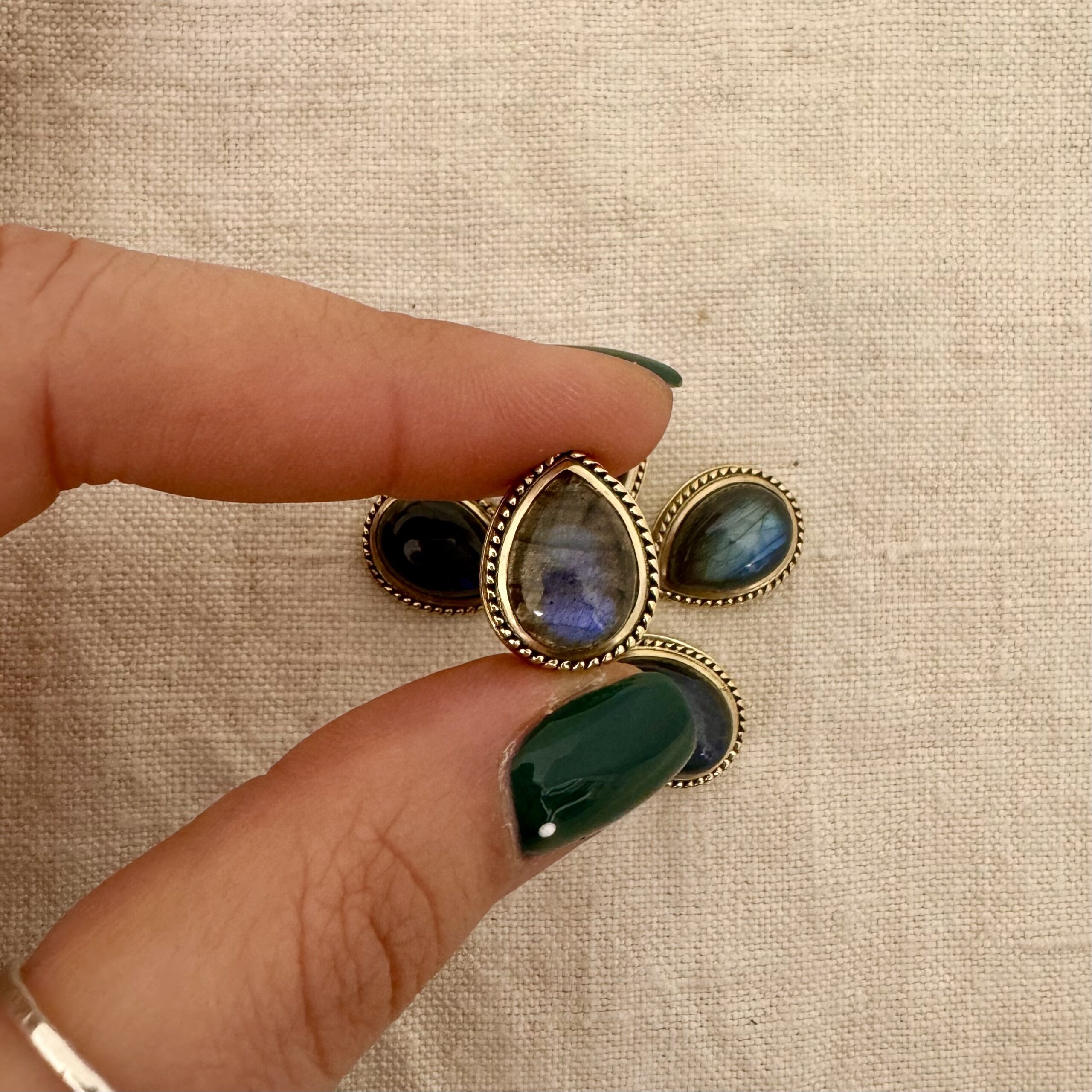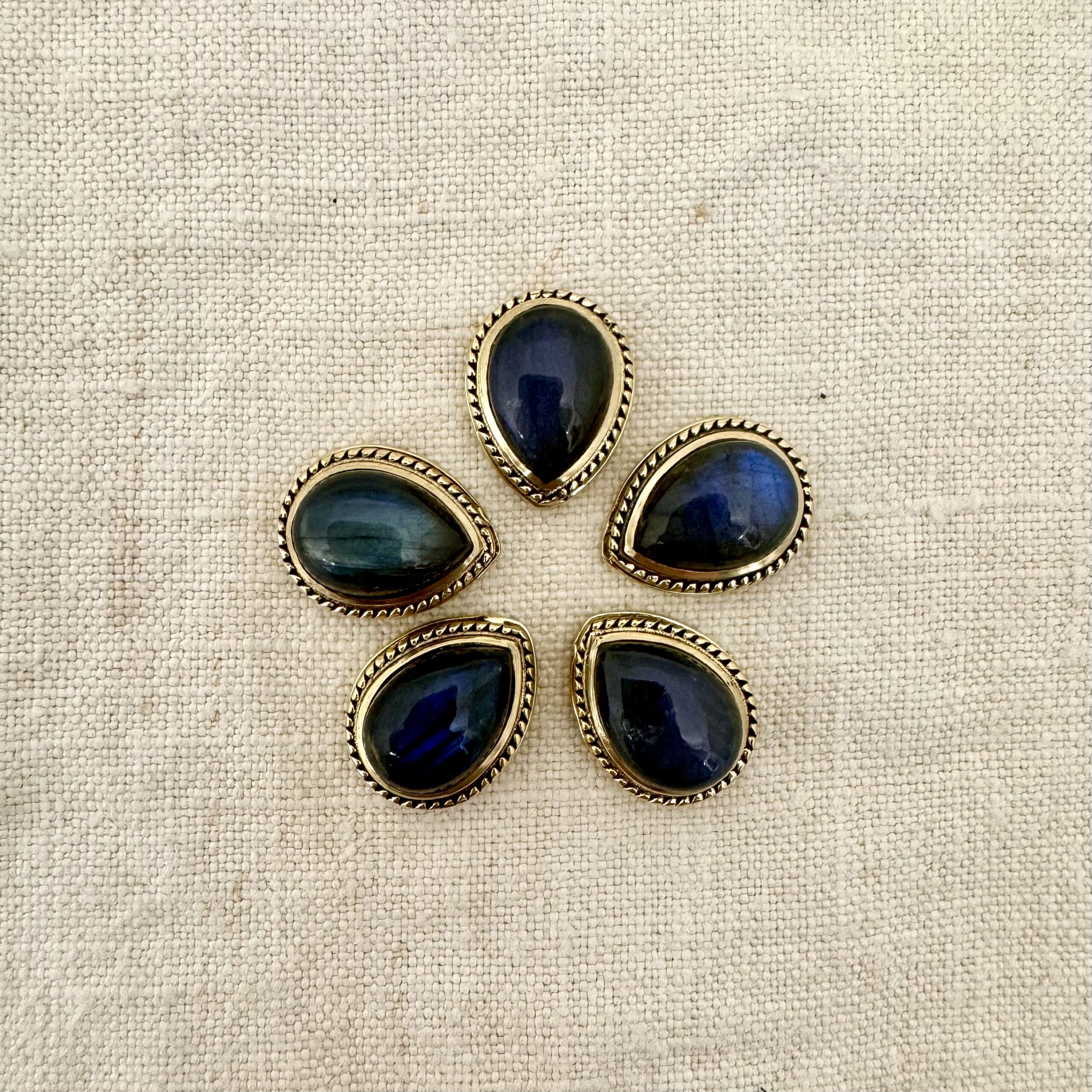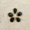 Goccia cabochon in labradorite con montatura in ottone e scalanatura laterale, perfetta per il macramè.