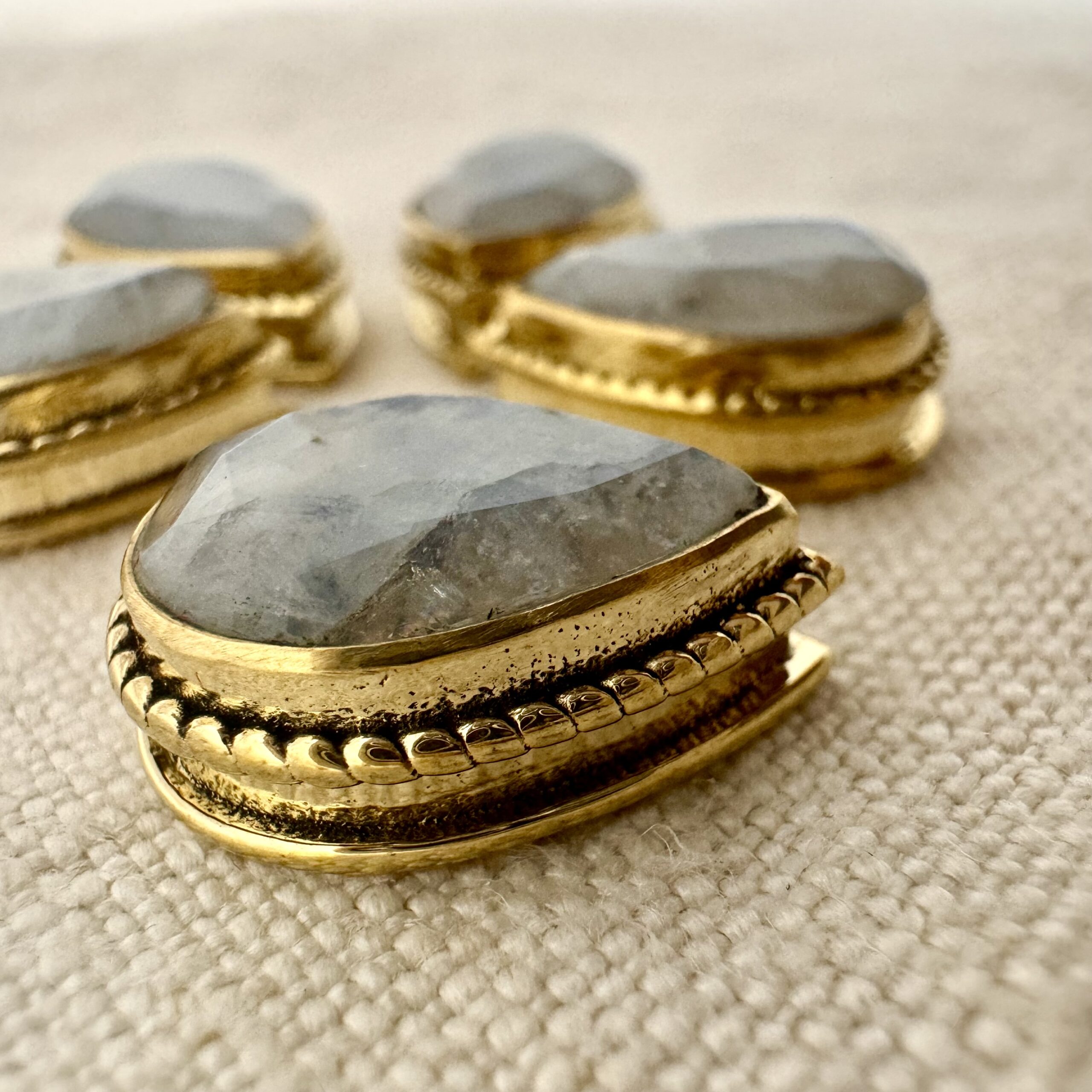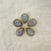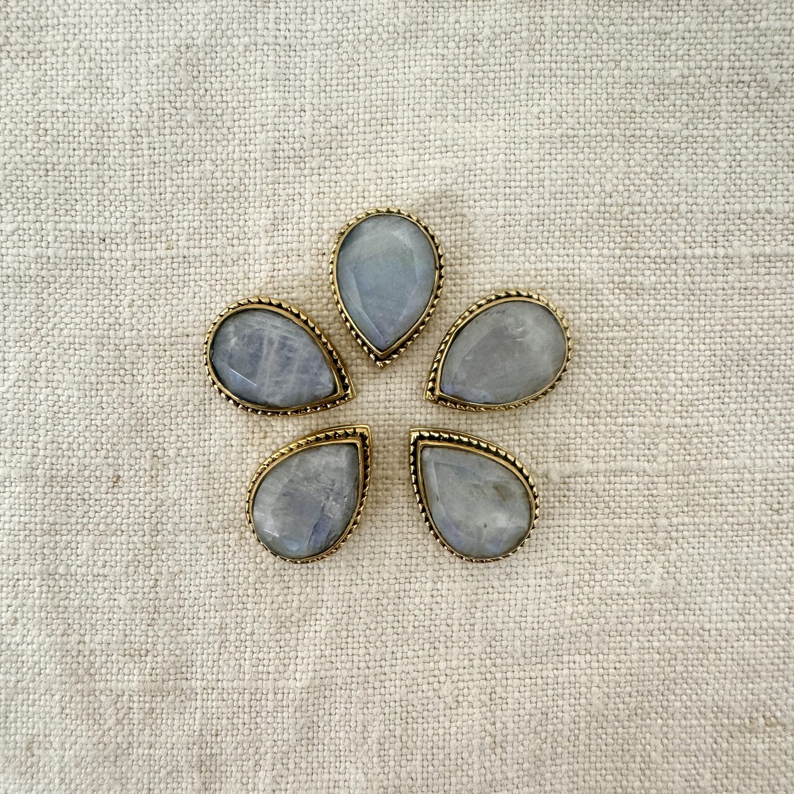 Goccia in labradorite bianca sfaccettata con montatura in ottone e scalanatura laterale, perfetta per il macramรจ.
