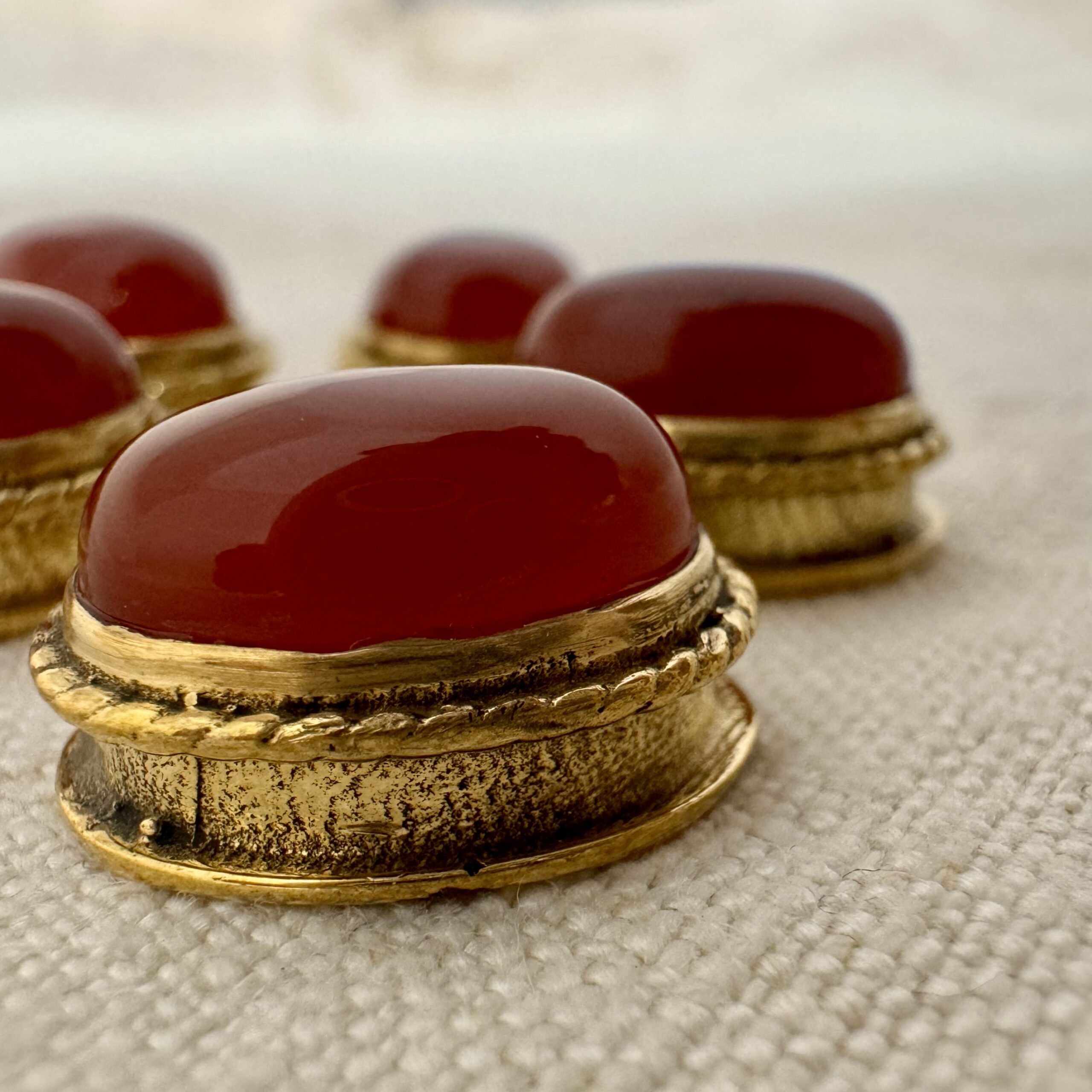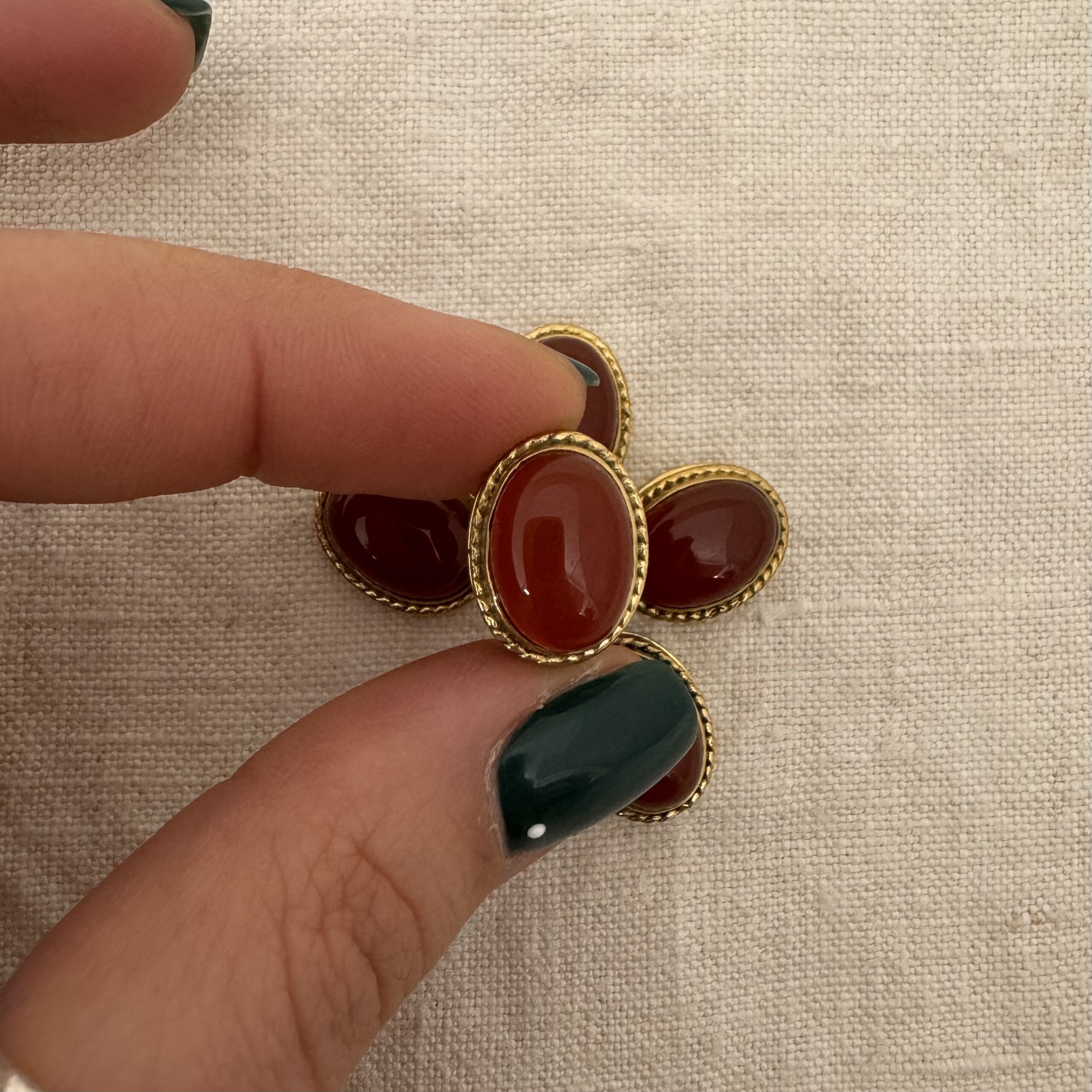 Ovale cabochon in corniola con montatura in ottone e scalanatura laterale, perfetta per il macramè.